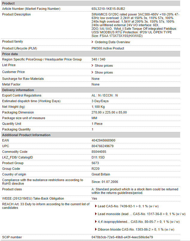 | SINAMICS G120C rated power 3AC380-480V +10/-20% 47-63Hz low overload: 2,2kW at 150% 3s, 110% 57s, 100% 240s high overload: 1,5kW at 200% 3s, 150% 57s, 100% 240s unfiltered external 24V I/O interface: 6DI, 2DO,1AI,1AO, 1Mot_t Safe Torque Off integrated Fieldbus: USS/ MODBUS RTU Protection: IP20/ UL OPEN TYPE Size: FSAA 173X73X155(HXWXD) |