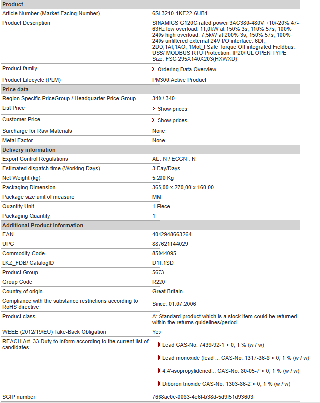 SINAMICS G120C rated power 3AC380-480V +10/-20% 47-63Hz low overload: 11,0kW at 150% 3s, 110% 57s, 100% 240s high overload: 7,5kW at 200% 3s, 150% 57s, 100% 240s unfiltered external 24V I/O interface: 6DI, 2DO,1AI,1AO, 1Mot_t Safe Torque Off integrated Fieldbus: USS/ MODBUS RTU Protection: IP20/ UL OPEN TYPE Size: FSC 295X140X203(HXWXD)