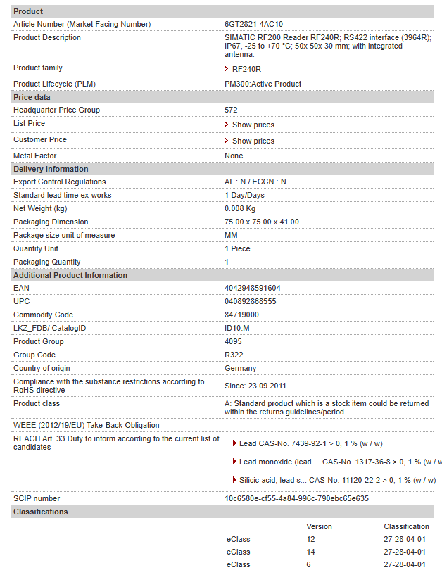 | SIMATIC RF200 Reader RF240R; RS422 interface (3964R); IP67, -25 to +70 °C; 50x 50x 30 mm; with integrated antenna. |
