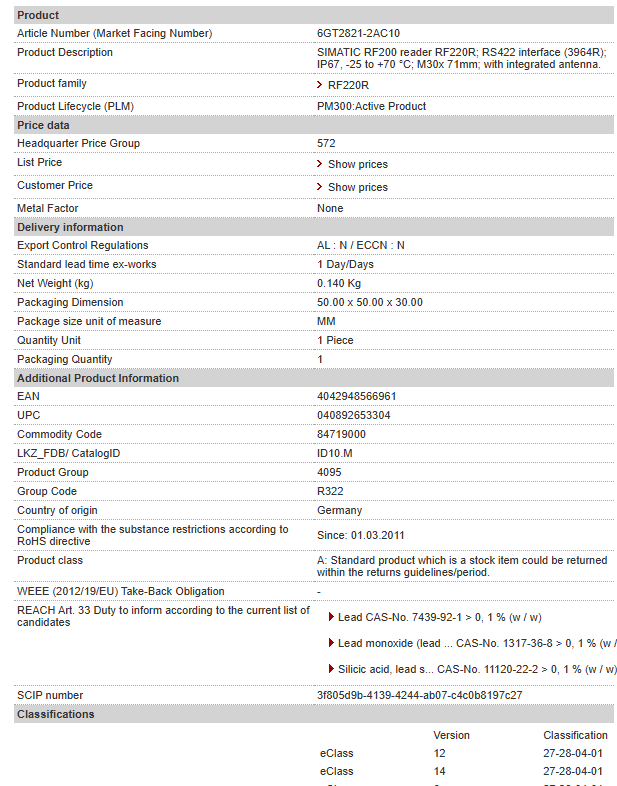 | SIMATIC RF200 reader RF220R; RS422 interface (3964R); IP67, -25 to +70 °C; M30x 71mm; with integrated antenna. |