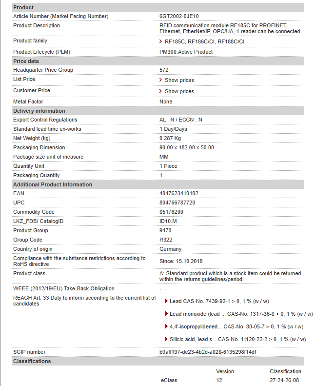 | RFID communication module RF185C for PROFINET, Ethernet, EtherNet/IP, OPC/UA, 1 reader can be connected |