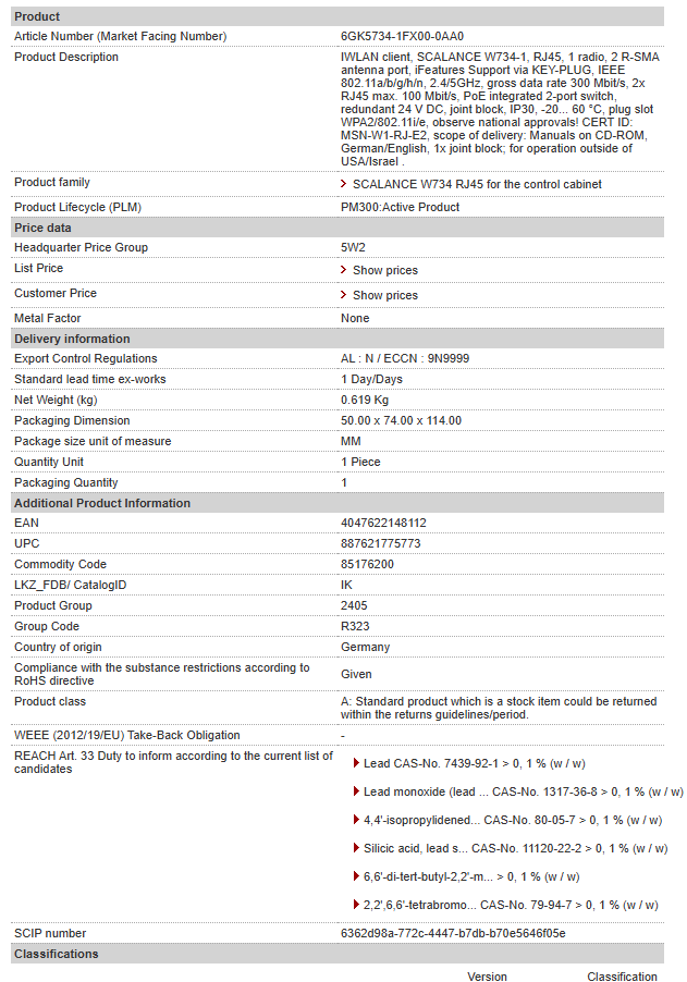 WLAN client, SCALANCE W734-1, RJ45, 1 radio, 2 R-SMA antenna port, iFeatures Support via KEY-PLUG, IEEE 802.11a/b/g/h/n, 2.4/5GHz, gross data rate 300 Mbit/s, 2x RJ45 max. 100 Mbit/s, PoE integrate……