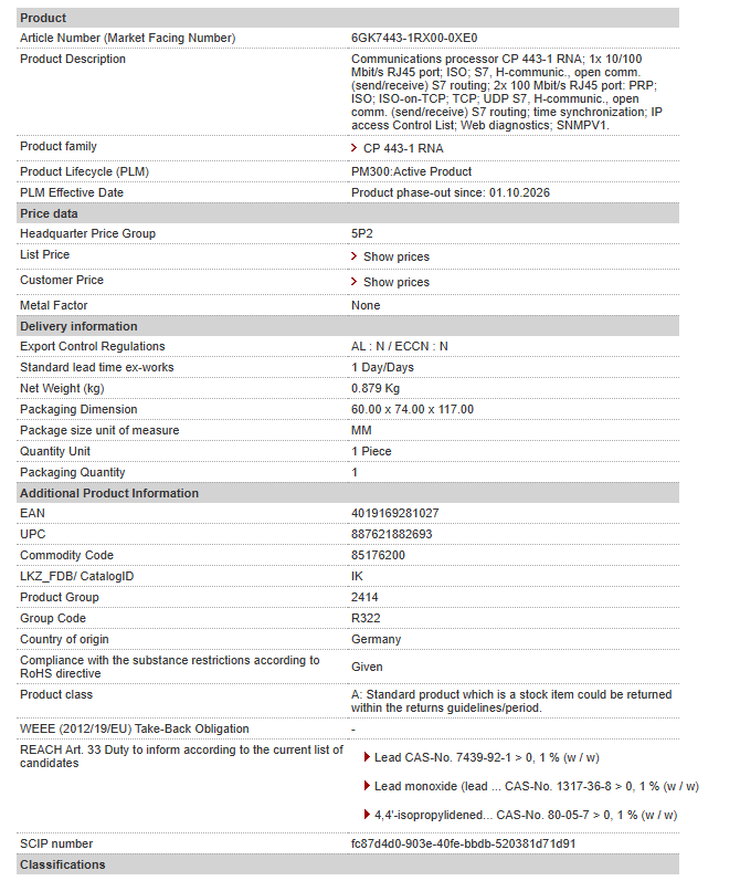| Communications processor CP 443-1 RNA; 1x 10/100 Mbit/s RJ45 port; ISO; S7, H-communic., open comm. (send/receive) S7 routing; 2x 100 Mbit/s RJ45 port: PRP; ISO; ISO-on-TCP; TCP; UDP S7, H-communic., open comm. (send/receive) S7 routing; time synchronization; IP access Control List; Web diagnostics; SNMPV1. |