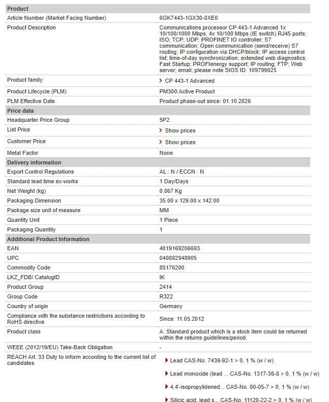 Communications processor CP 443-1 Advanced 1x 10/100/1000 Mbps, 4x 10/100 Mbps (IE switch) RJ45 ports; ISO; TCP; UDP; PROFINET IO controller; S7 communication; Open communication (send/receive) S7 routing; IP configuration via DHCP/block; IP access control list; time-of-day synchronization; extended web diagnostics; Fast Startup; PROFIenergy support; IP routing; FTP; Web server; email; please note SIOS ID: 109799025