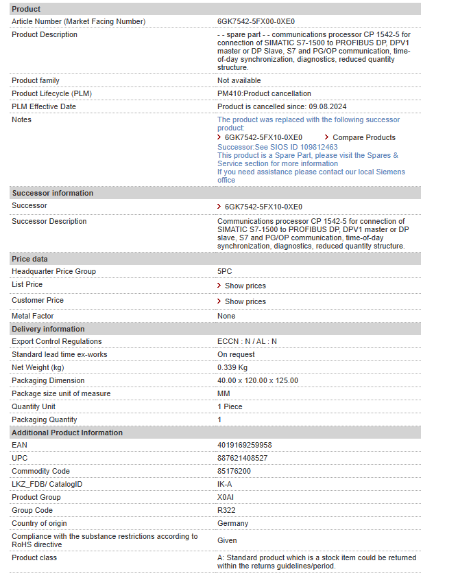– – spare part – – communications processor CP 1542-5 for connection of SIMATIC S7-1500 to PROFIBUS DP, DPV1 master or DP Slave, S7 and PG/OP communication, time-of-day synchronization, diagnostics, reduced quantity structure.
