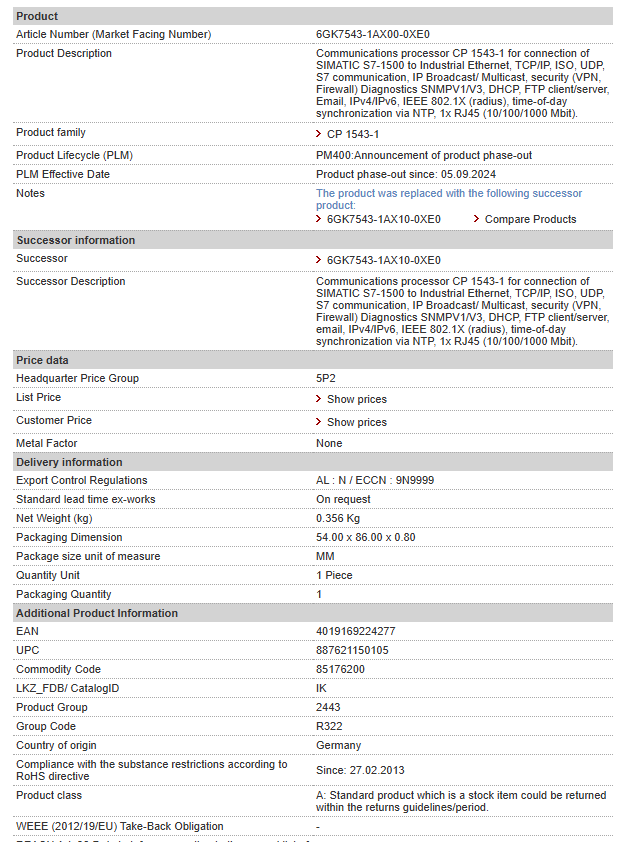 Communications processor CP 1543-1 for connection of SIMATIC S7-1500 to Industrial Ethernet, TCP/IP, ISO, UDP, S7 communication, IP Broadcast/ Multicast, security (VPN, Firewall) Diagnostics SNMPV1/V3, DHCP, FTP client/server, Email, IPv4/IPv6, IEEE 802.1X (radius), time-of-day synchronization via NTP, 1x RJ45 (10/100/1000 Mbit).