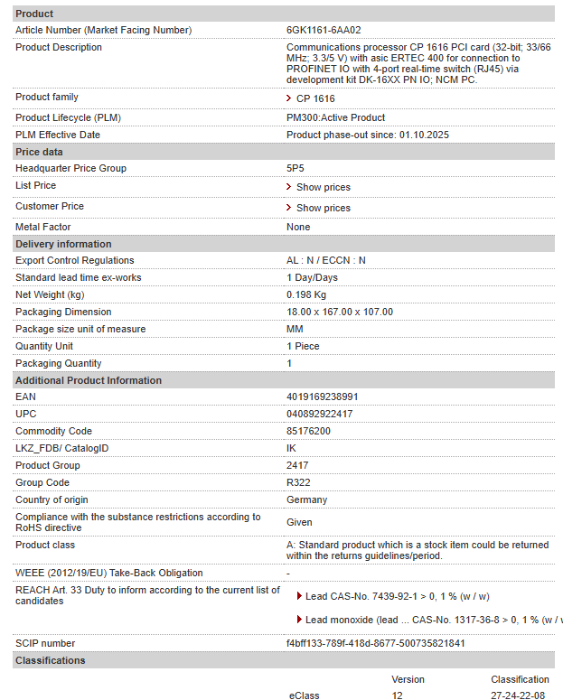 Communications processor CP 1616 PCI card (32-bit; 33/66 MHz; 3.3/5 V) with asic ERTEC 400 for connection to PROFINET IO with 4-port real-time switch (RJ45) via development kit DK-16XX PN IO; NCM P……