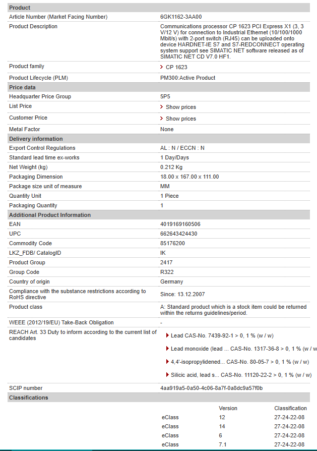 | Communications processor CP 1623 PCI Express X1 (3, 3 V/12 V) for connection to Industrial Ethernet (10/100/1000 Mbit/s) with 2-port switch (RJ45) can be uploaded onto device HARDNET-IE S7 and S7-REDCONNECT operating system support see SIMATIC NET software released as of SIMATIC NET CD V7.0 HF1. |