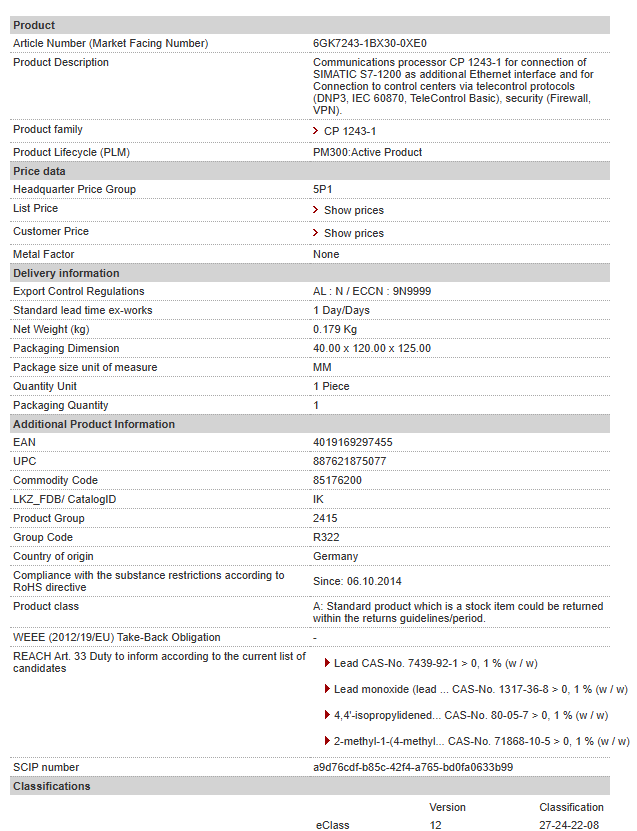 | Communications processor CP 1243-1 for connection of SIMATIC S7-1200 as additional Ethernet interface and for Connection to control centers via telecontrol protocols (DNP3, IEC 60870, TeleControl Basic), security (Firewall, VPN). |