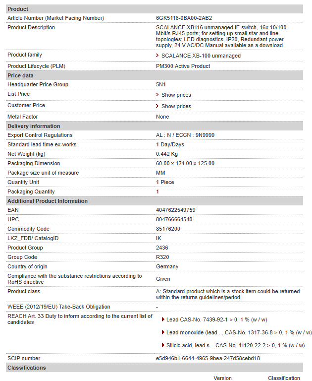| SCALANCE XB116 unmanaged IE switch, 16x 10/100 Mbit/s RJ45 ports; for setting up small star and line topologies; LED diagnostics, IP20, Redundant power supply, 24 V AC/DC Manual available as a download . |
