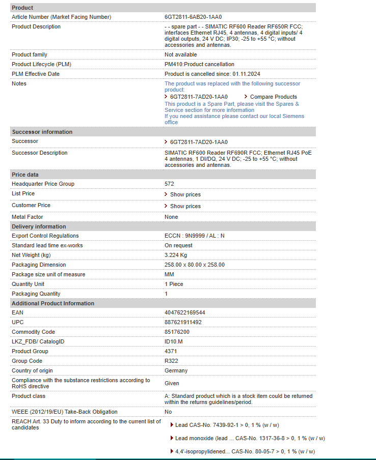 | – spare part – – SIMATIC RF600 Reader RF650R FCC; interfaces Ethernet RJ45, 4 antennas, 4 digital inputs/ 4 digital outputs, 24 V DC; IP30; -25 to +55 °C; without accessories and antennas. |