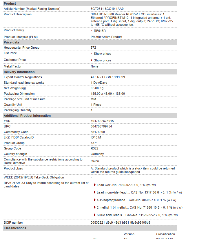 SIMATIC RF600 Reader RF615R FCC; interfaces: 1 Ethernet / PROFINET M12; 1 integrated antenna + 1 ext. antenna port; 1 dig. input, 1 dig. output; 24 V DC; IP67;-25 to +55 °C without accessories.