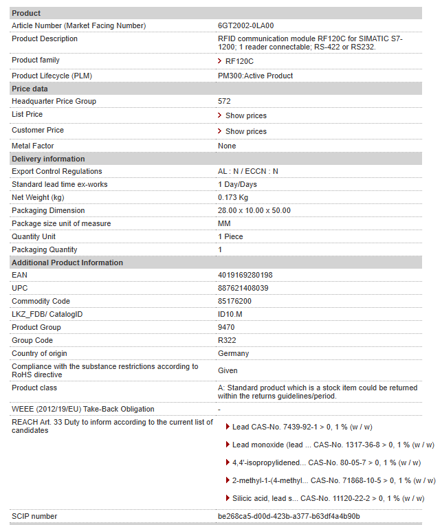 | RFID communication module RF120C for SIMATIC S7-1200; 1 reader connectable; RS-422 or RS232. |