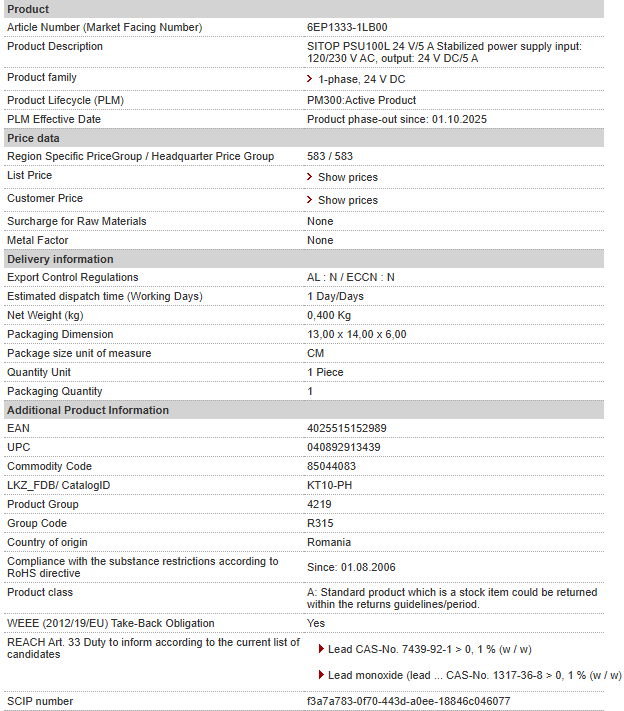 | SITOP PSU100L 24 V/5 A Stabilized power supply input: 120/230 V AC, output: 24 V DC/5 A |
