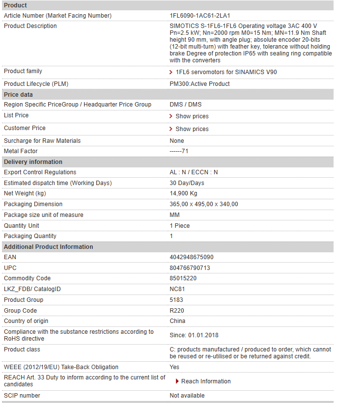 | SIMOTICS S-1FL6-1FL6 Operating voltage 3AC 400 V Pn=2.5 kW; Nn=2000 rpm M0=15 Nm; MN=11.9 Nm Shaft height 90 mm, with angle plug; absolute encoder 20-bits (12-bit multi-turn) with feather key, tolerance without holding brake Degree of protection IP65 with sealing ring compatible with the converters |