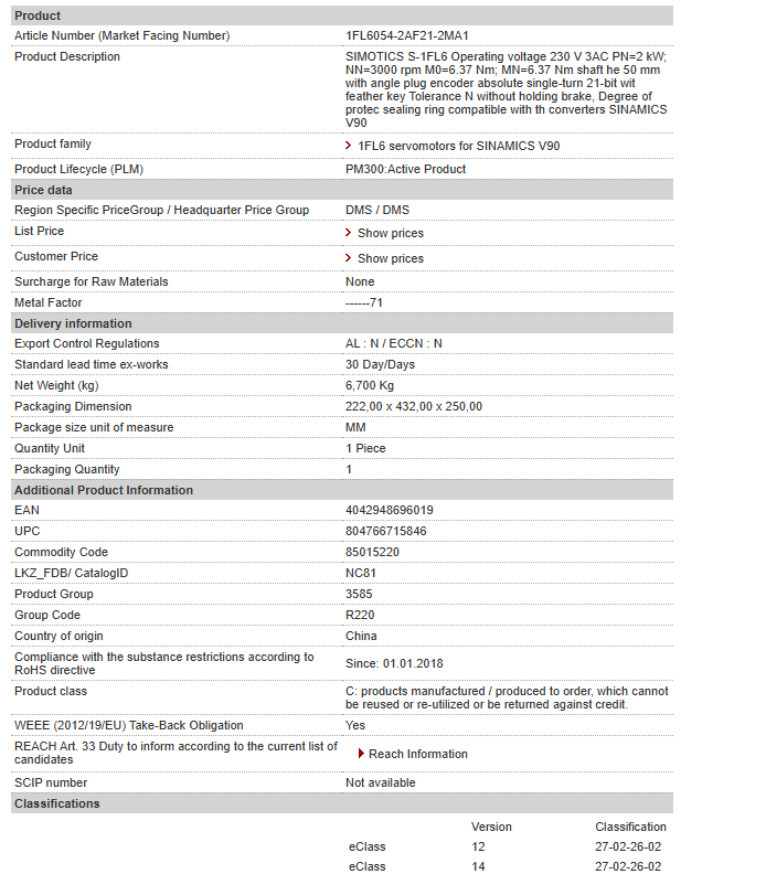 | SIMOTICS S-1FL6 Operating voltage 230 V 3AC PN=2 kW; NN=3000 rpm M0=6.37 Nm; MN=6.37 Nm shaft he 50 mm with angle plug encoder absolute single-turn 21-bit wit feather key Tolerance N without holding brake, Degree of protec sealing ring compatible with th converters SINAMICS V90 |