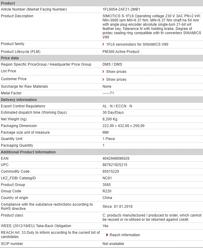 SIMOTICS S-1FL6 Operating voltage 230 V 3AC PN=2 kW; NN=3000 rpm M0=6.37 Nm; MN=6.37 Nm shaft he 50 mm with angle plug encoder absolute single-turn 21-bit wit feather key, Tolerance N with holding brake, Degree of protec sealing ring compatible with th converters SINAMICS V90
