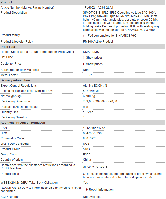 | SIMOTICS S-1FL6-1FL6 Operating voltage 3AC 400 V Pn=1 kW; Nn=2000 rpm M0=6 Nm; MN=4.78 Nm Shaft height 65 mm, with angle plug; absolute encoder 20-bits (12-bit multi-turn) with feather key, tolerance N without holding brake Degree of protection IP65 with sealing ring compatible with the converters SINAMICS V70 & V90 |
