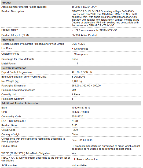 | SIMOTICS S-1FL6-1FL6 Operating voltage 3AC 400 V Pn=1.5 kW; Nn=2000 rpm M0=8 Nm; MN=7.16 Nm Shaft height 65 mm, with angle plug; incremental encoder 2500 incr./rev. with feather key, tolerance N without holding brake Degree of protection IP65 with sealing ring compatible with the converters SINAMICS V70 & V90 |