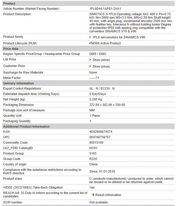 SIMOTICS S-1FL6 Operating voltage 3AC 400 V Pn=0.75 kW; Nn=3000 rpm M0=3.5 Nm; MN=2.39 Nm Shaft height 45 mm, with angle plug; incremental encoder 2500 incr./rev. with feather key, tolerance N without holding brake Degree of protection IP65 with sealing ring compatible with the converters SINAMICS V70 & V90
