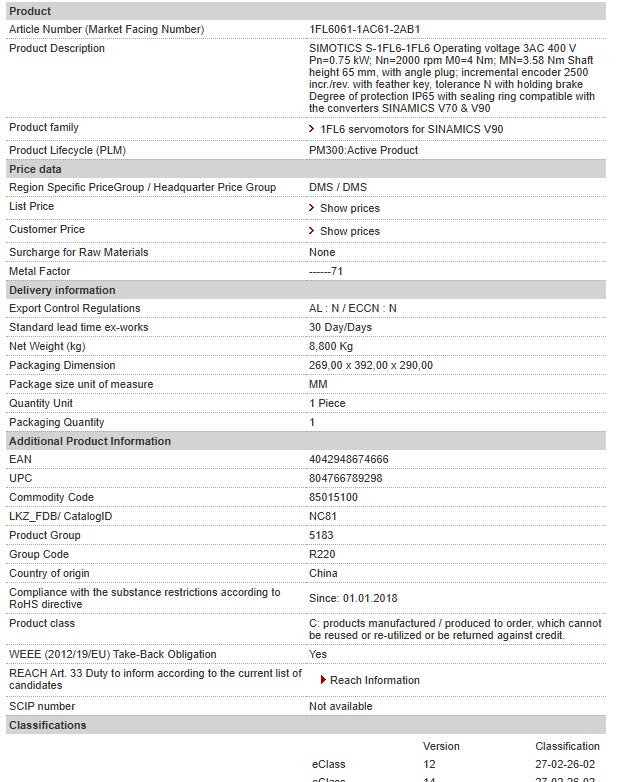 SIMOTICS S-1FL6-1FL6 Operating voltage 3AC 400 V Pn=0.75 kW; Nn=2000 rpm M0=4 Nm; MN=3.58 Nm Shaft height 65 mm, with angle plug; incremental encoder 2500 incr./rev. with feather key, tolerance N with holding brake Degree of protection IP65 with sealing ring compatible with the converters SINAMICS V70 & V90