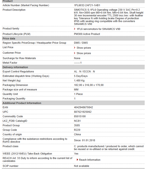 SIMOTICS S-1FL6 Operating voltage 230 V 3AC Pn=0.2 kW; Nn=3000 rpm M0=0.64 Nm; MN=0.64 Nm; Shaft height 30 mm Incremental encoder TTL 2500 incr./rev. with feather key Tolerance N with holding brake Degree of protection IP65 with sealing ring compatible with the converters SINAMICS V90