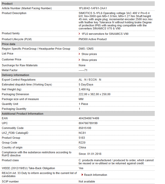 | SIMOTICS S-1FL6 Operating voltage 3AC 400 V Pn=0.4 kW; Nn=3000 rpm M0=1.9 Nm; MN=1.27 Nm Shaft height 45 mm, with angle plug; incremental encoder 2500 incr./rev. with feather key Tolerance N without holding brake Degree of protection IP65 with sealing ring compatible with the converters SINAMICS V70 & V90 |