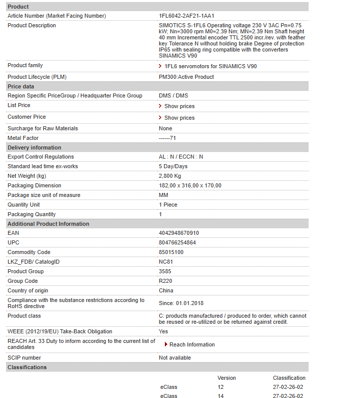 SIMOTICS S-1FL6 Operating voltage 230 V 3AC Pn=0.75 kW; Nn=3000 rpm M0=2.39 Nm; MN=2.39 Nm Shaft height 40 mm Incremental encoder TTL 2500 incr./rev. with feather key Tolerance N without holding brake Degree of protection IP65 with sealing ring compatible with the converters SINAMICS V90