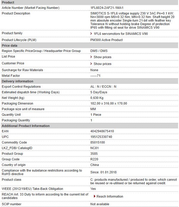 | SIMOTICS S-1FL6 voltage supply 230 V 3AC Pn=0.1 kW; Nn=3000 rpm M0=0.32 Nm; MN=0.32 Nm. Shaft height 20 mm absolute encoder Single-turn 21-bit with feather key Tolerance N without holding brake Degree of protection IP65 with fitting oil seal for drive SINAMICS V90 |