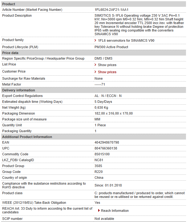 SIMOTICS S-1FL6 Operating voltage 230 V 3AC Pn=0.1 kW; Nn=3000 rpm M0=0.32 Nm; MN=0.32 Nm Shaft height 20 mm Incremental encoder TTL 2500 incr./rev. with feather key Tolerance N without holding bra……