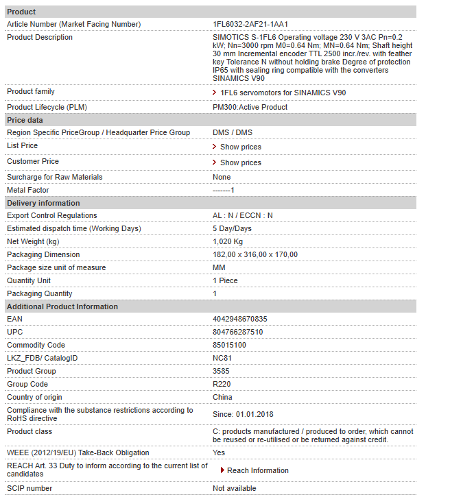 | SIMOTICS S-1FL6 Operating voltage 230 V 3AC Pn=0.2 kW; Nn=3000 rpm M0=0.64 Nm; MN=0.64 Nm; Shaft height 30 mm Incremental encoder TTL 2500 incr./rev. with feather key Tolerance N without holding brake Degree of protection IP65 with sealing ring compatible with the converters SINAMICS V90 |
