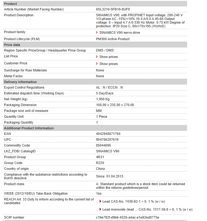 SINAMICS V90, with PROFINET Input voltage: 200-240 V 1/3-phase AC -15%/+10% 10.4 A/5.0 A 45-66 Output voltage: 0 – Input 4.7 A 0-330 Hz Motor: 0.75 kW Degree of protection: IP20 Size C, 80x170x195 ……