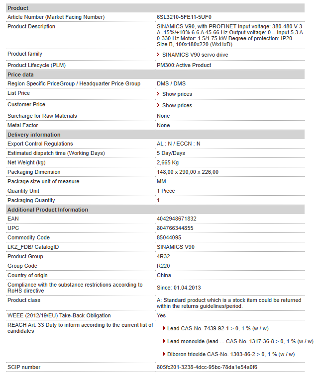 SINAMICS V90, with PROFINET Input voltage: 380-480 V 3 A -15%/+10% 6.6 A 45-66 Hz Output voltage: 0 – Input 5.3 A 0-330 Hz Motor: 1.5/1.75 kW Degree of protection: IP20 Size B, 100x180x220 (WxHxD) ……