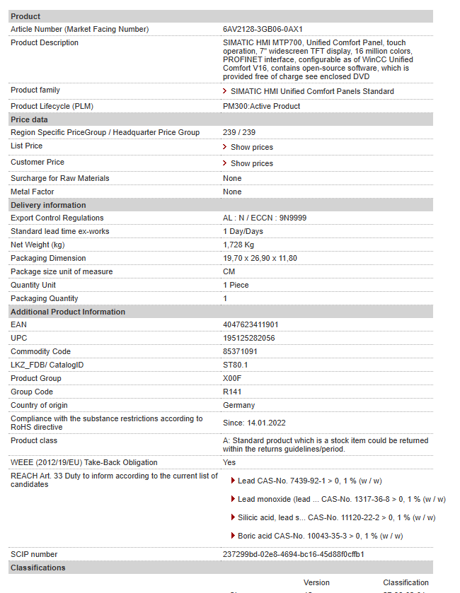 | SIMATIC HMI MTP700, Unified Comfort Panel, touch operation, 7″ widescreen TFT display, 16 million colors, PROFINET interface, configurable as of WinCC Unified Comfort V16, contains open-source software, which is provided free of charge see enclosed DVD |