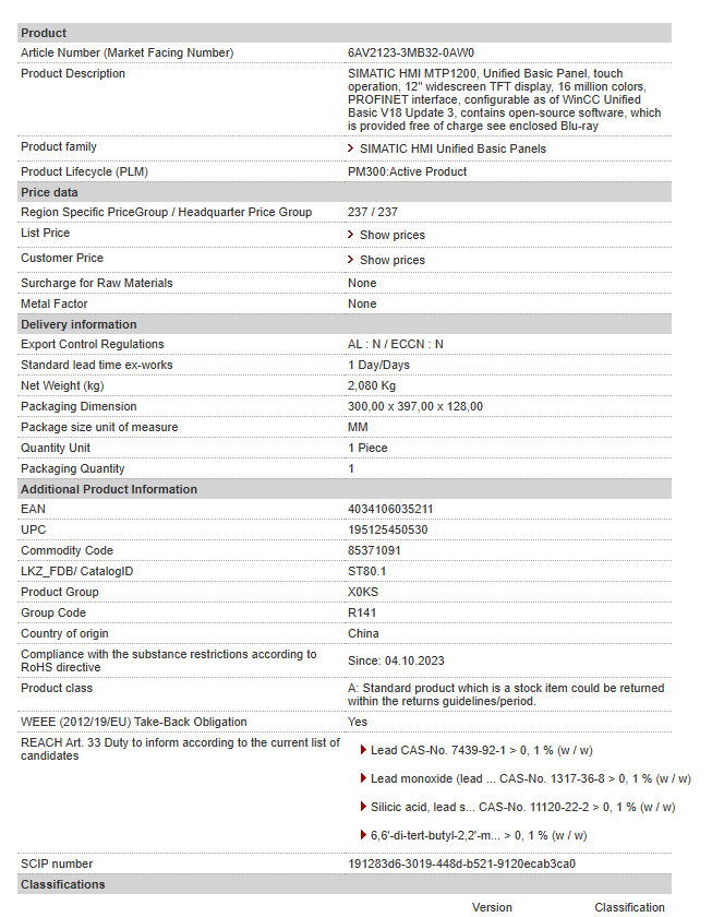 | SIMATIC HMI MTP1200, Unified Basic Panel, touch operation, 12″ widescreen TFT display, 16 million colors, PROFINET interface, configurable as of WinCC Unified Basic V18 Update 3, contains open-source software, which is provided free of charge see enclosed Blu-ray |