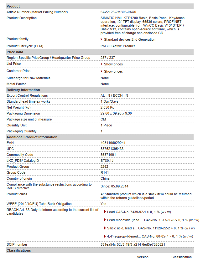 | SIMATIC HMI, KTP1200 Basic, Basic Panel, Key/touch operation, 12″ TFT display, 65536 colors, PROFINET interface, configurable from WinCC Basic V13/ STEP 7 Basic V13, contains open-source software, which is provided free of charge see enclosed CD |