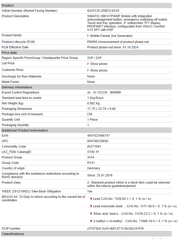 | SIMATIC HMI KTP400F Mobile with integrated acknowledgement button, emergency switching-off switch, Touch and Key operation, 4″ widescreen TFT display, PROFINET interface, configurable from WinCC Comfort V13 SP1 with HSP |