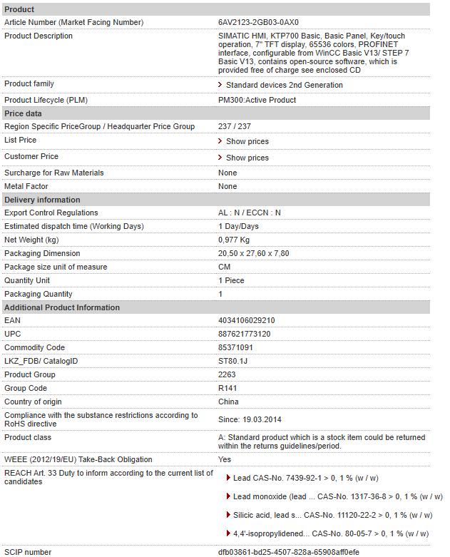 | SIMATIC HMI, KTP700 Basic, Basic Panel, Key/touch operation, 7″ TFT display, 65536 colors, PROFINET interface, configurable from WinCC Basic V13/ STEP 7 Basic V13, contains open-source software, which is provided free of charge see enclosed CD |