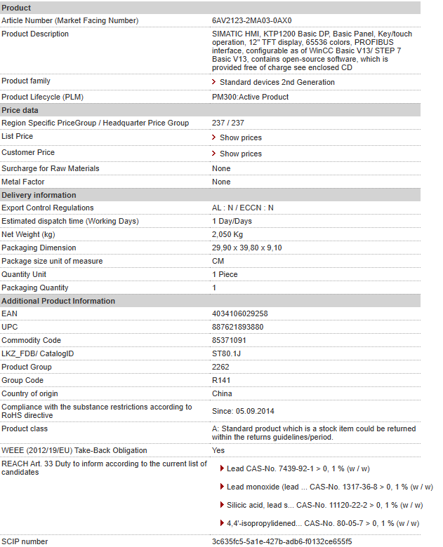 | SIMATIC HMI, KTP1200 Basic DP, Basic Panel, Key/touch operation, 12″ TFT display, 65536 colors, PROFIBUS interface, configurable as of WinCC Basic V13/ STEP 7 Basic V13, contains open-source software, which is provided free of charge see enclosed CD |