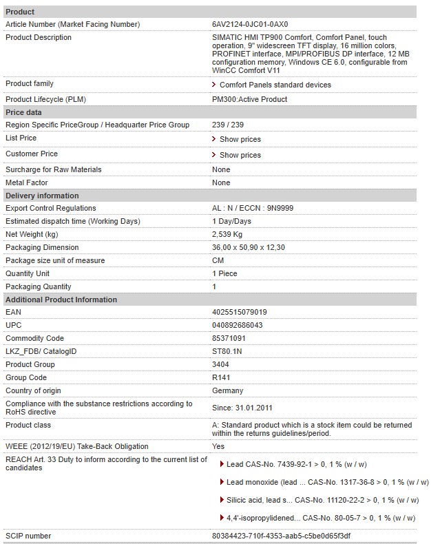 | SIMATIC HMI TP900 Comfort, Comfort Panel, touch operation, 9″ widescreen TFT display, 16 million colors, PROFINET interface, MPI/PROFIBUS DP interface, 12 MB configuration memory, Windows CE 6.0, configurable from WinCC Comfort V11 |