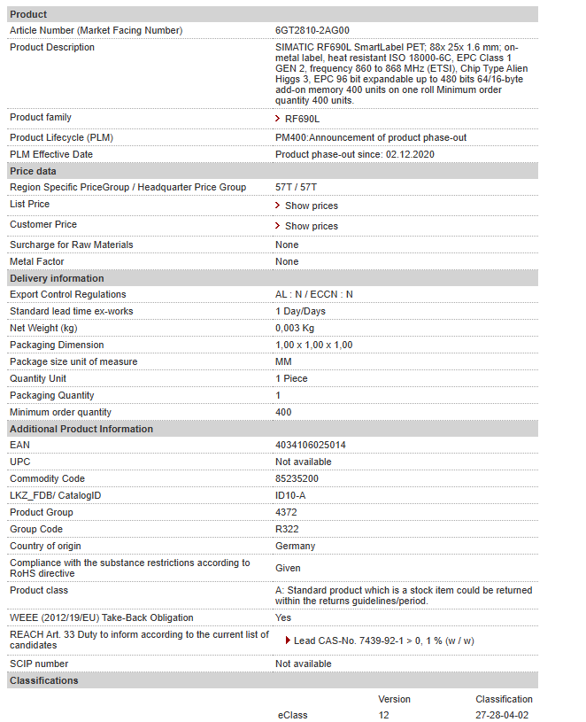 | SIMATIC RF690L SmartLabel PET; 88x 25x 1.6 mm; on-metal label, heat resistant ISO 18000-6C, EPC Class 1 GEN 2, frequency 860 to 868 MHz (ETSI), Chip Type Alien Higgs 3, EPC 96 bit expandable up to 480 bits 64/16-byte add-on memory 400 units on one roll Minimum order quantity 400 units. |