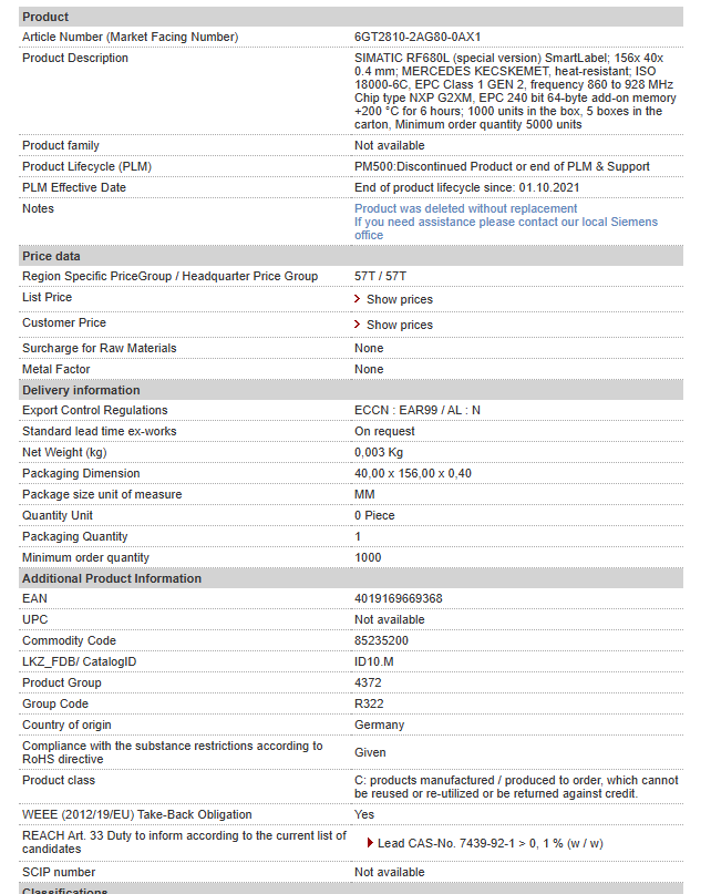 | SIMATIC RF680L (special version) SmartLabel; 156x 40x 0.4 mm; MERCEDES KECSKEMET, heat-resistant; ISO 18000-6C, EPC Class 1 GEN 2, frequency 860 to 928 MHz Chip type NXP G2XM, EPC 240 bit 64-byte add-on memory +200 °C for 6 hours; 1000 units in the box, 5 boxes in the carton, Minimum order quantity 5000 units |