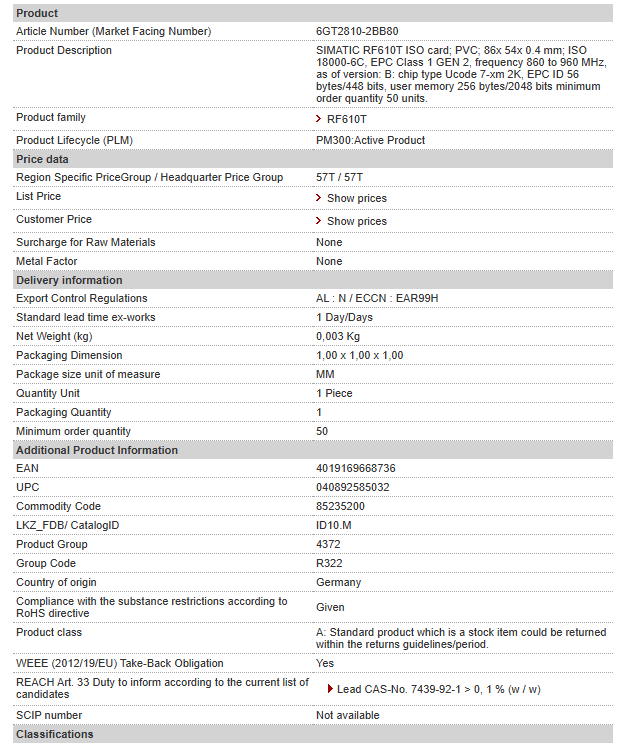 SIMATIC RF610T ISO card; PVC; 86x 54x 0.4 mm; ISO 18000-6C, EPC Class 1 GEN 2, frequency 860 to 960 MHz, as of version: B: chip type Ucode 7-xm 2K, EPC ID 56 bytes/448 bits, user memory 256 bytes/2048 bits minimum order quantity 50 units.
