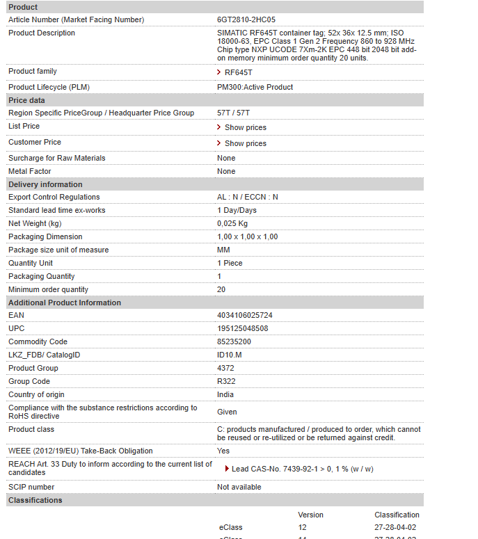 SIMATIC RF645T container tag; 52x 36x 12.5 mm; ISO 18000-63, EPC Class 1 Gen 2 Frequency 860 to 928 MHz Chip type NXP UCODE 7Xm-2K EPC 448 bit 2048 bit add-on memory minimum order quantity 20 units……