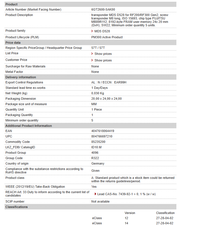 | transponder MDS D528 for RF200/RF300 Gen2, screw transponder M8 long, ISO 15693, chip type FUJITSU MB89R112, 8192-byte FRAM user memory 24x 20 mm (DxH); SW22; Minimum order quantity 5 units. |