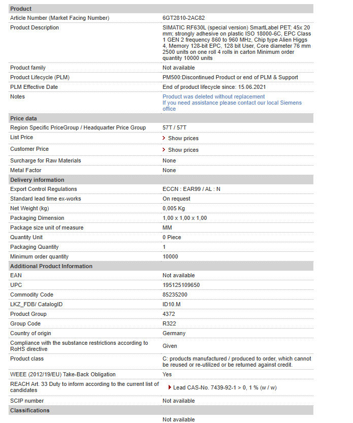 | SIMATIC RF630L (special version) SmartLabel PET; 45x 20 mm; strongly adhesive on plastic ISO 18000-6C, EPC Class 1 GEN 2 frequency 860 to 960 MHz, Chip type Alien Higgs 4, Memory 128-bit EPC, 128 bit User, Core diameter 76 mm 2500 units on one roll 4 rolls in carton Minimum order quantity 10000 units |