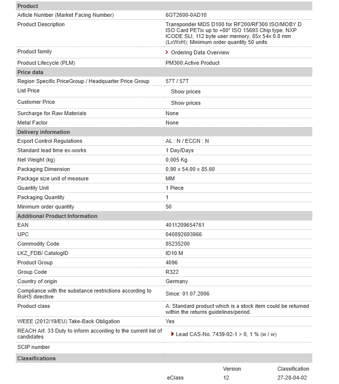 | Transponder MDS D100 for RF200/RF300 ISO/MOBY D ISO Card PETix up to +80° ISO 15693 Chip type, NXP ICODE SLI, 112 byte user memory; 85x 54x 0.8 mm (LxWxH); Minimum order quantity 50 units. |