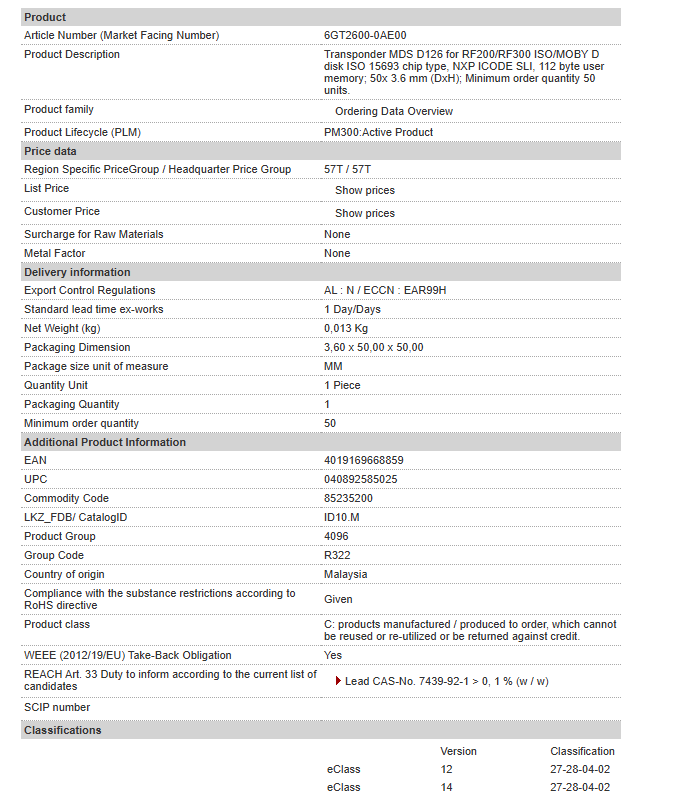 | Transponder MDS D126 for RF200/RF300 ISO/MOBY D disk ISO 15693 chip type, NXP ICODE SLI, 112 byte user memory; 50x 3.6 mm (DxH); Minimum order quantity 50 units. |