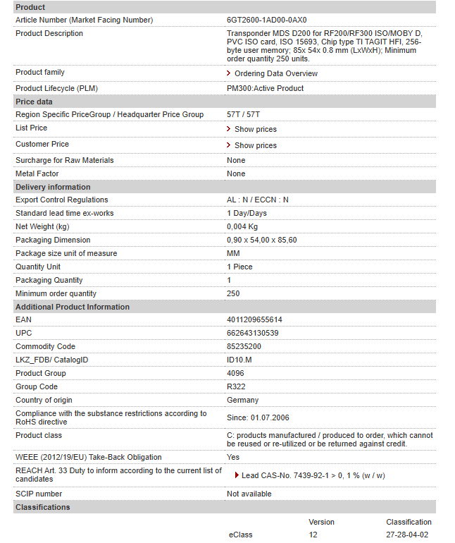 Transponder MDS D200 for RF200/RF300 ISO/MOBY D, PVC ISO card, ISO 15693, Chip type TI TAGIT HFI, 256-byte user memory; 85x 54x 0.8 mm (LxWxH); Minimum order quantity 250 units.