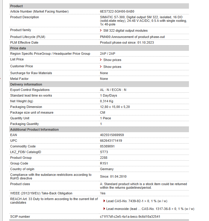 SIMATIC S7-300, Digital output SM 322, isolated, 16 DO (solid-state relay), 24-48 V AC/DC; 0.5 A with single rooting, 1x 40-pole